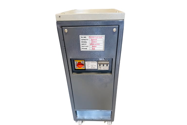 A 10 KVA 3 Phase Servo Stabilizer is designed to deliver a stable 400V three-phase output by automatically correcting fluctuations in the incoming voltage between 295V and 470V. It ensures balanced voltage across all three phases, protecting your equipment from instability and enabling smooth, efficient operation.